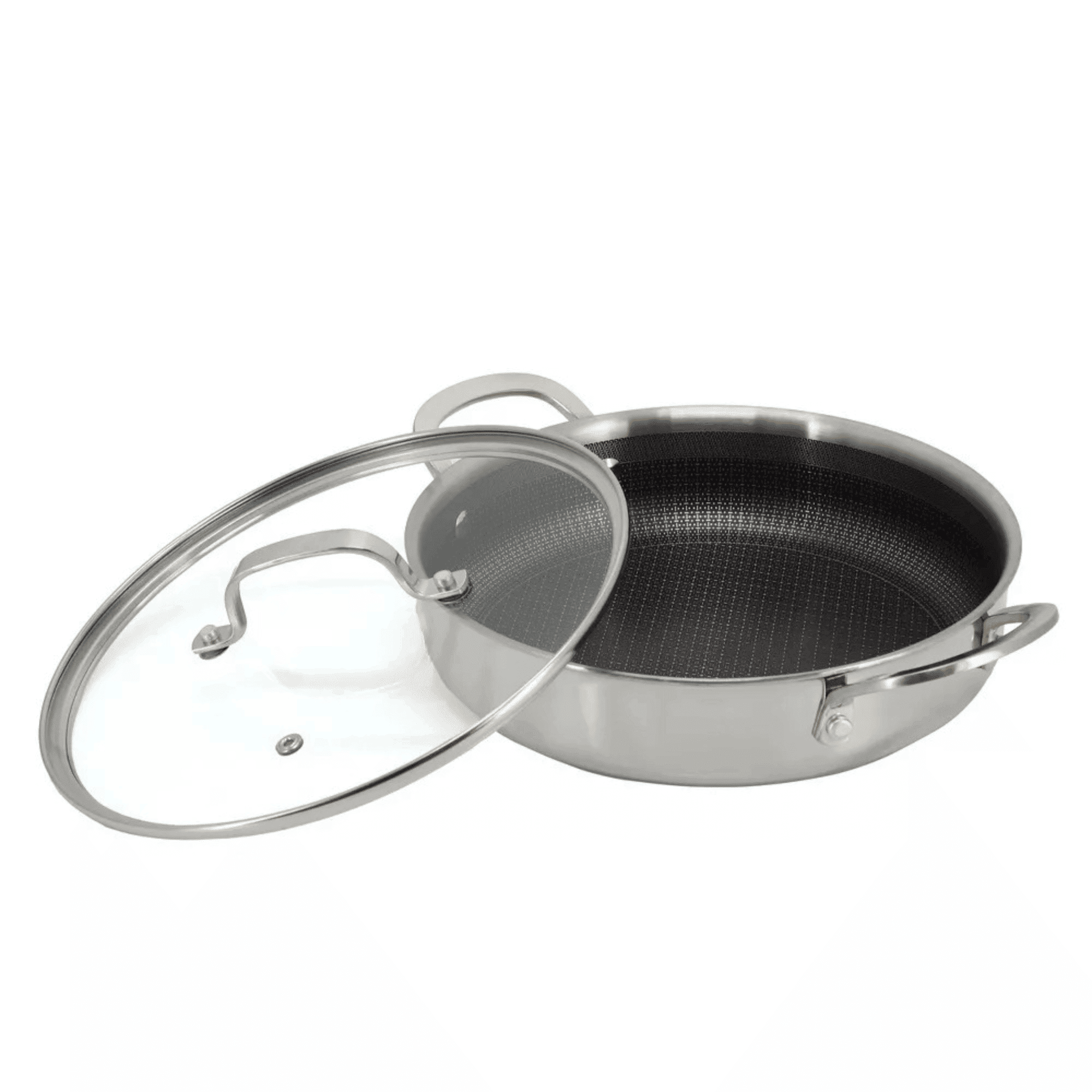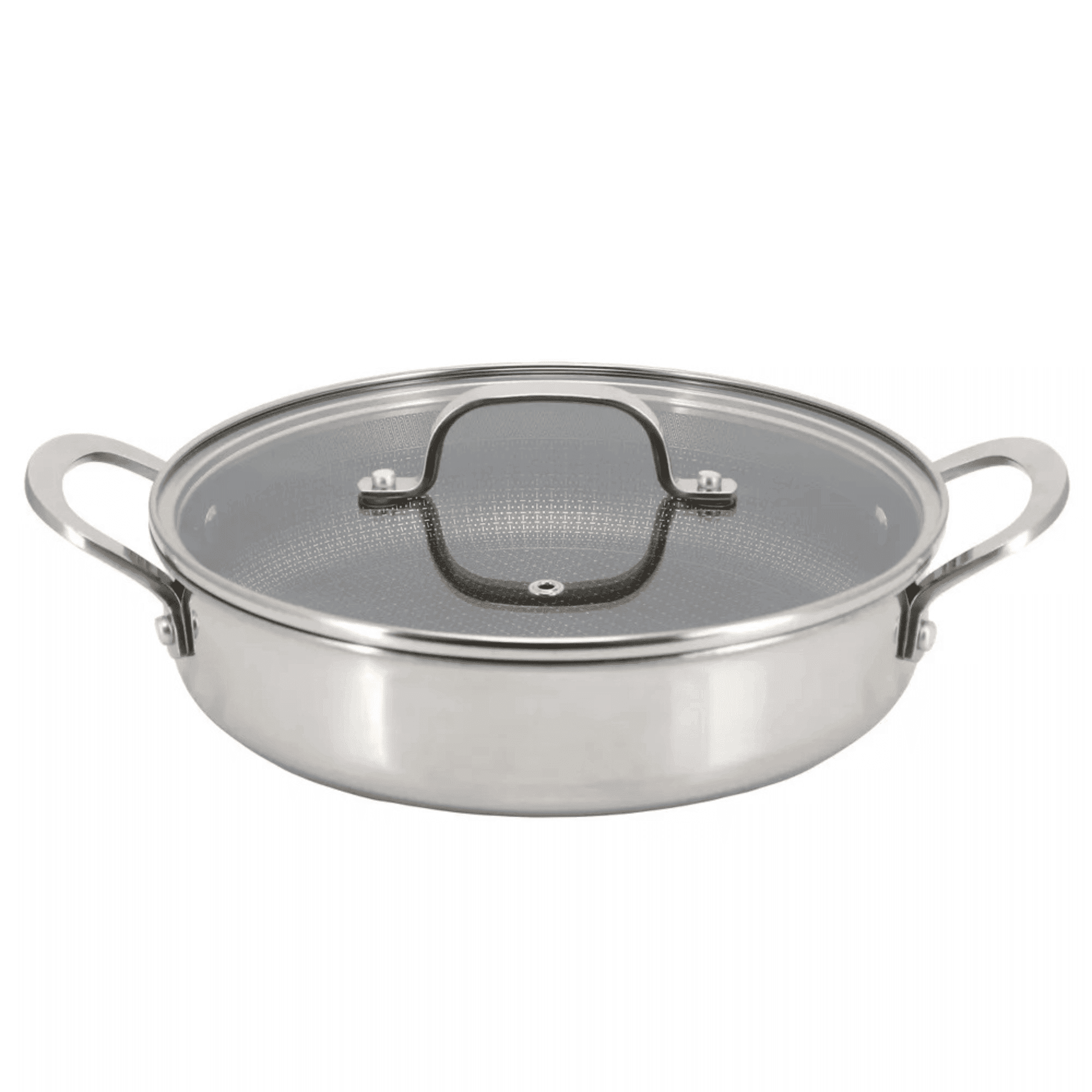 Elevate your kitchen with the Better Chef 9-Inch 3-Ply Stainless Steel Nonstick Deep Fry Pan with Lid in a sleek silver finish. Built for both performance and style, this versatile pan features a PFOA-free nonstick surface that makes food release effortless and is safe to use with smooth-edged metal utensils. Its triple-layer stainless steel design ensures even heat distribution - ideal for everything from frying and sauteing to searing. The double-riveted handle provides a sturdy, comfortable grip, and the included tempered glass lid helps seal in moisture and flavor. Compatible with all stovetops - including induction, gas, electric, halogen, and vitroceramic - this pan is oven-safe up to 500F (or 350F with the lid), making it easy to move from stovetop to oven. While it's dishwasher safe for quick cleanup, hand washing is recommended to extend its life. Whether you're whipping up a weekday meal or experimenting with new recipes, this deep fry pan is a kitchen essential.
